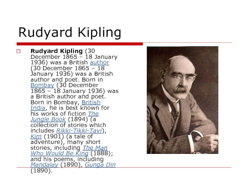 British author (30 December 1865 – 18 January 1936) was a British author and poet. Born in Bombay (30 December 1865 – 18 January 1936) was a British author and poet. Born in Bombay, British India, he is best known for his works of fiction The Jungle Book (1894) (a collection of stories which includes Rikki-Tikki-Tavi), Kim (1901) (a tale of adventure), many short stories, including The Man Who Would Be King (1888); and his poems, including Mandalay (1890), Gunga Din (1890).