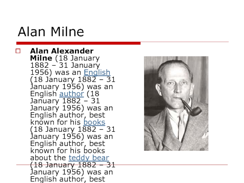 was an English (18 January 1882 – 31 January 1956) was an English author (18 January 1882 – 31 January 1956) was an English author, best known for his books (18 January 1882 – 31 January 1956) was an English author, best known for his books about the teddy bear (18 January 1882 – 31 January 1956) was an English author, best known for his books about the teddy bear Winnie-the-Pooh and for various children's poems. Milne was a noted writer, primarily as a playwright, before the huge success of Pooh overshadowed all his previous work.