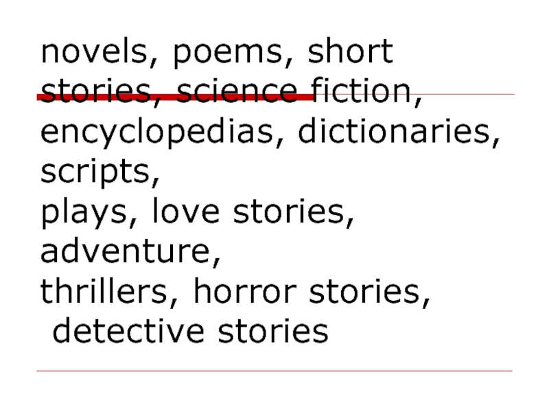 Слайд 2novels, poems, short stories, science fiction, encyclopedias, dictionaries, scripts,