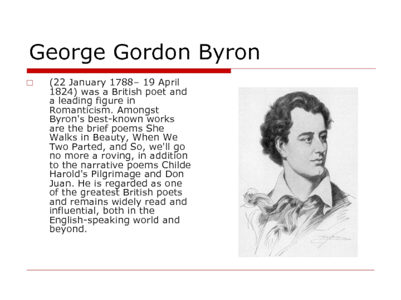 poet and a leading figure in Romanticism. Amongst Byron's best-known works are the brief poems She Walks in Beauty, When We Two Parted, and So, we'll go no more a roving, in addition to the narrative poems Childe Harold's Pilgrimage and Don Juan. He is regarded as one of the greatest British poets and remains widely read and influential, both in the English-speaking world and beyond.