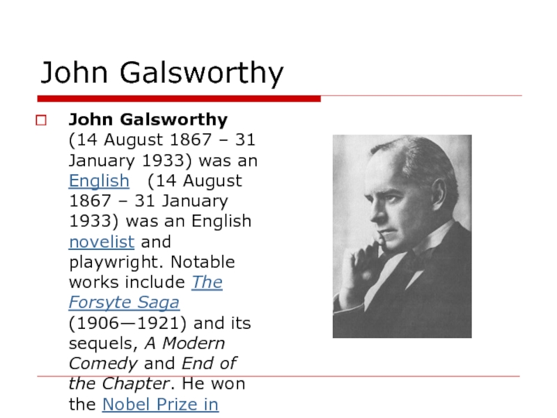 was an English (14 August 1867 – 31 January 1933) was an English novelist and playwright. Notable works include The Forsyte Saga (1906—1921) and its sequels, A Modern Comedy and End of the Chapter. He won the Nobel Prize in Literature in 1932.