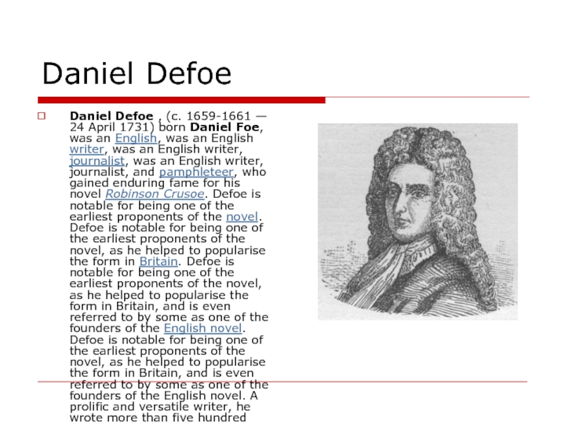 Daniel Foe, was an English, was an English writer, was an English writer, journalist, was an English writer, journalist, and pamphleteer, who gained enduring fame for his novel Robinson Crusoe. Defoe is notable for being one of the earliest proponents of the novel. Defoe is notable for being one of the earliest proponents of the novel, as he helped to popularise the form in Britain. Defoe is notable for being one of the earliest proponents of the novel, as he helped to popularise the form in Britain, and is even referred to by some as one of the founders of the English novel. Defoe is notable for being one of the earliest proponents of the novel, as he helped to popularise the form in Britain, and is even referred to by some as one of the founders of the English novel. A prolific and versatile writer, he wrote more than five hundred books, pamphlets, and journals on various topics (including politics, crime, religion, marriage, psychology and the supernatural). He was also a pioneer of economic journalism.