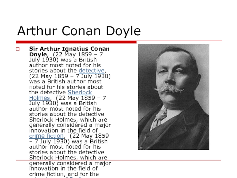 7 July 1930) was a British author most noted for his stories about the detective, (22 May 1859 – 7 July 1930) was a British author most noted for his stories about the detective Sherlock Holmes, (22 May 1859 – 7 July 1930) was a British author most noted for his stories about the detective Sherlock Holmes, which are generally considered a major innovation in the field of crime fiction, (22 May 1859 – 7 July 1930) was a British author most noted for his stories about the detective Sherlock Holmes, which are generally considered a major innovation in the field of crime fiction, and for the adventures of Professor Challenger, (22 May 1859 – 7 July 1930) was a British author most noted for his stories about the detective Sherlock Holmes, which are generally considered a major innovation in the field of crime fiction, and for the adventures of Professor Challenger. He was a prolific writer whose other works include science fiction, (22 May 1859 – 7 July 1930) was a British author most noted for his stories about the detective Sherlock Holmes, which are generally considered a major innovation in the field of crime fiction, and for the adventures of Professor Challenger. He was a prolific writer whose other works include science fiction stories, historical novels, plays and romances, poetry, and non-fiction.