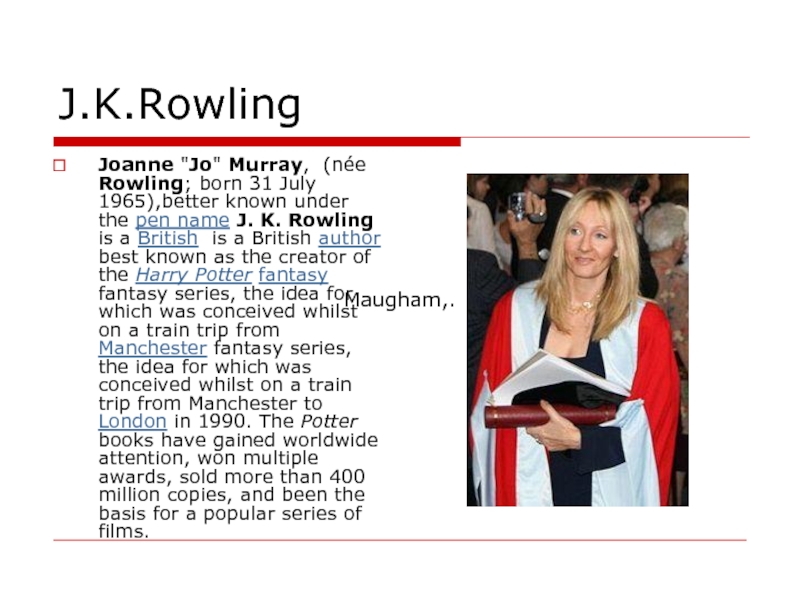 the pen name J. K. Rowling is a British is a British author best known as the creator of the Harry Potter fantasy fantasy series, the idea for which was conceived whilst on a train trip from Manchester fantasy series, the idea for which was conceived whilst on a train trip from Manchester to London in 1990. The Potter books have gained worldwide attention, won multiple awards, sold more than 400 million copies, and been the basis for a popular series of films.