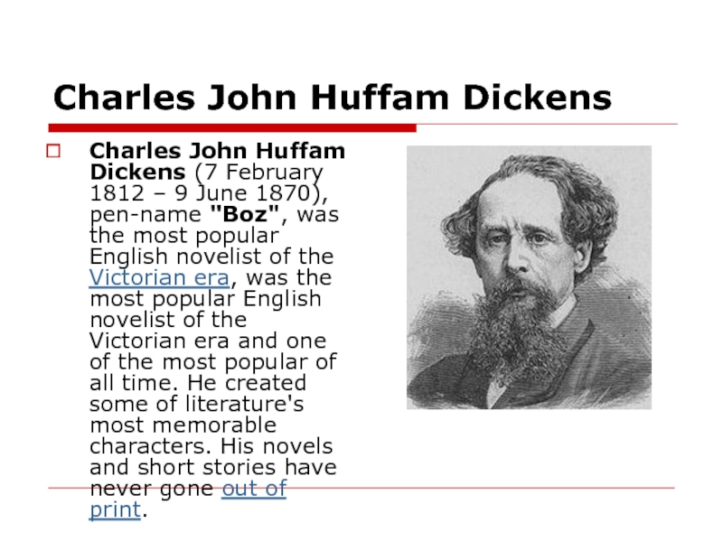 9 June 1870), pen-name "Boz", was the most popular English novelist of the Victorian era, was the most popular English novelist of the Victorian era and one of the most popular of all time. He created some of literature's most memorable characters. His novels and short stories have never gone out of print.