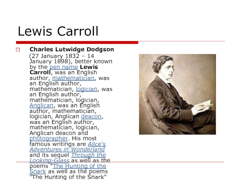 14 January 1898), better known by the pen name Lewis Carroll, was an English author, mathematician, was an English author, mathematician, logician, was an English author, mathematician, logician, Anglican, was an English author, mathematician, logician, Anglican deacon, was an English author, mathematician, logician, Anglican deacon and photographer. His most famous writings are Alice's Adventures in Wonderland and its sequel Through the Looking-Glass as well as the poems "The Hunting of the Snark as well as the poems "The Hunting of the Snark" and "Jabberwocky as well as the poems "The Hunting of the Snark" and "Jabberwocky", all examples of the genre of literary nonsense.