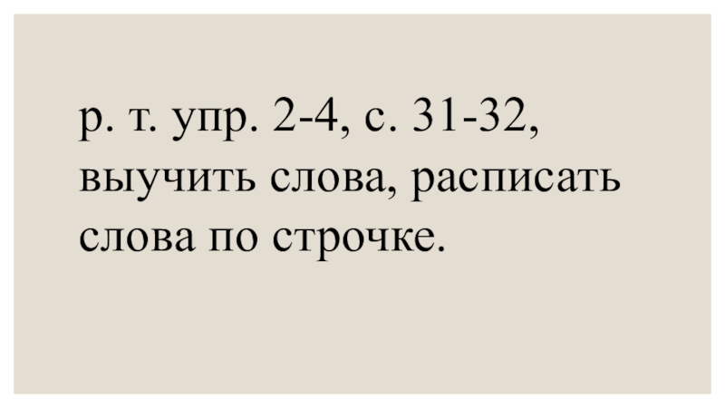 Слайд 6р. т. упр. 2-4, с. 31-32, выучить слова, расписать слова по