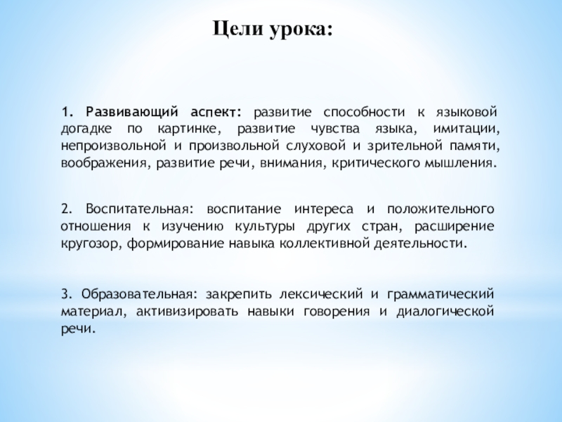 2. Воспитательная: воспитание интереса и положительного отношения к изучению культуры других стран, расширение кругозор, формирование навыка коллективной деятельности.