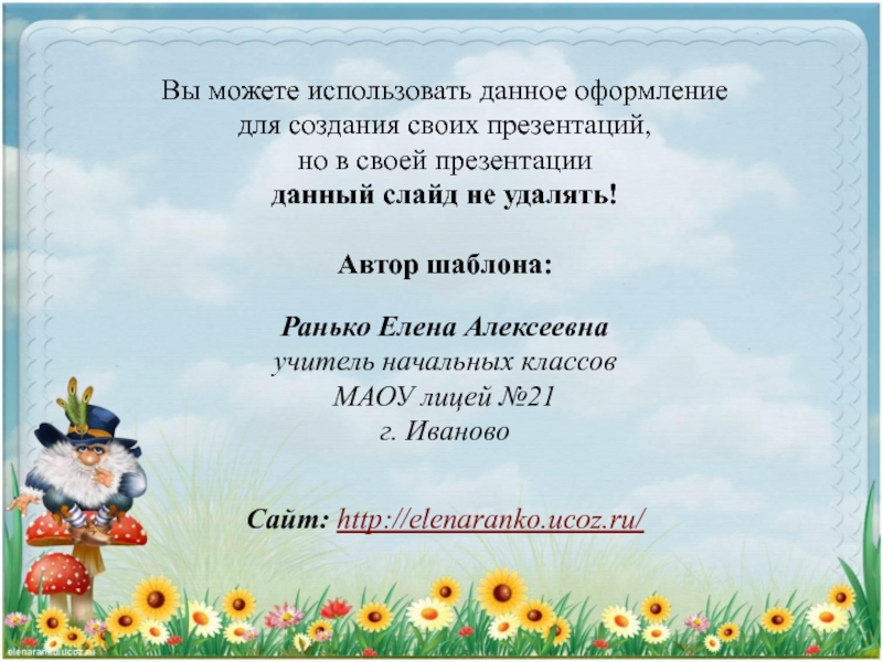 Вы можете использовать данное оформление для создания своих презентаций, но в своей презентации данный слайд не удалять!Автор