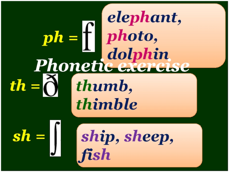 elephant, photo, dolphin the, this, their, themPhonetic exerciseph = th = thumb, thimblesh =ship, sheep, fish