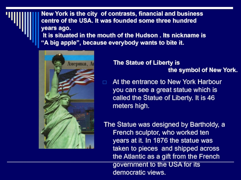 New York is the city of contrasts, financial and business centre of the USA. It was founded some three hundred years ago.