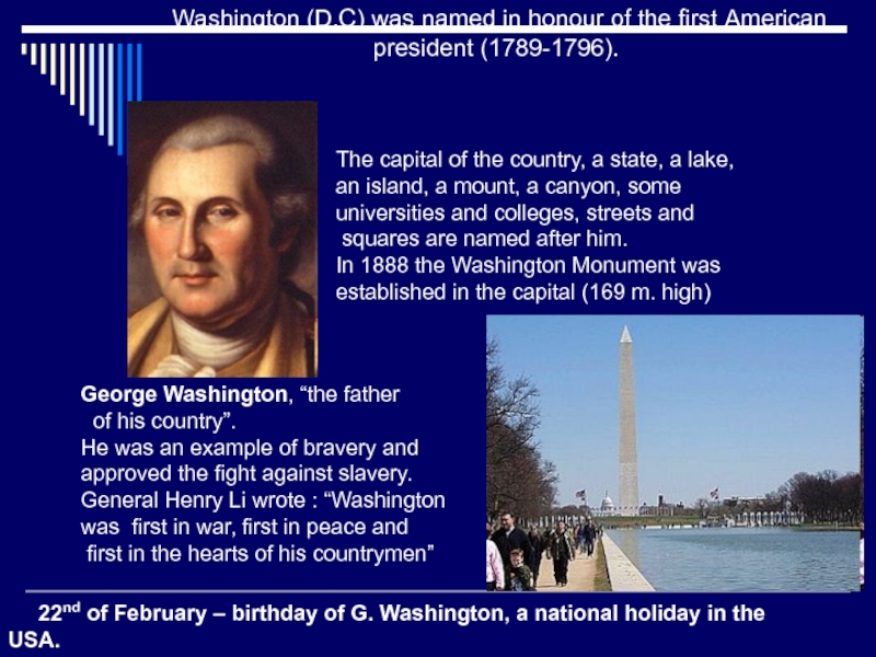 22nd of February – birthday of G. Washington, a national holiday in the USA.