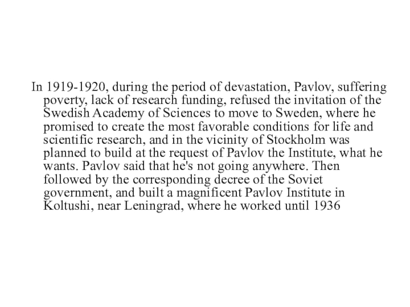 suffering poverty, lack of research funding, refused the invitation of the Swedish Academy of Sciences to move to Sweden, where he promised to create the most favorable conditions for life and scientific research, and in the vicinity of Stockholm was planned to build at the request of Pavlov the Institute, what he wants. Pavlov said that he's not going anywhere. Then followed by the corresponding decree of the Soviet government, and built a magnificent Pavlov Institute in Koltushi, near Leningrad, where he worked until 1936