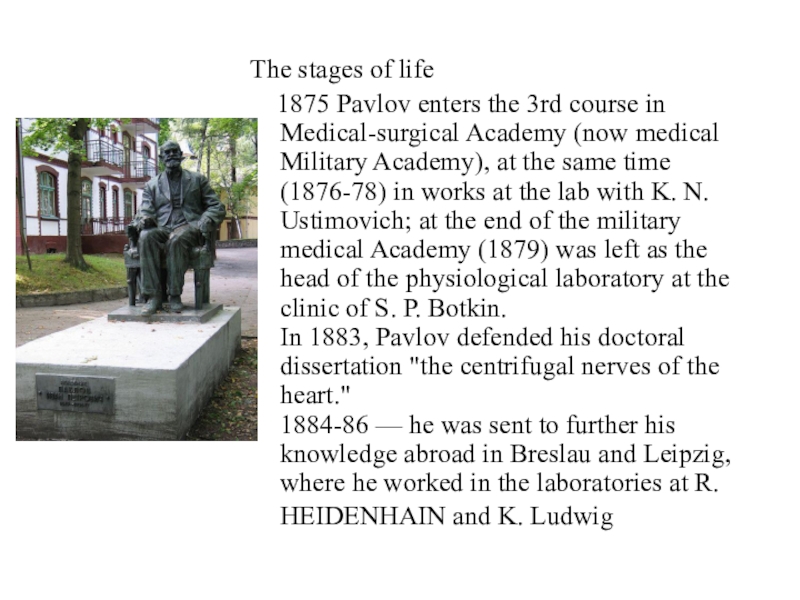 course in Medical-surgical Academy (now medical Military Academy), at the same time (1876-78) in works at the lab with K. N. Ustimovich; at the end of the military medical Academy (1879) was left as the head of the physiological laboratory at the clinic of S. P. Botkin.