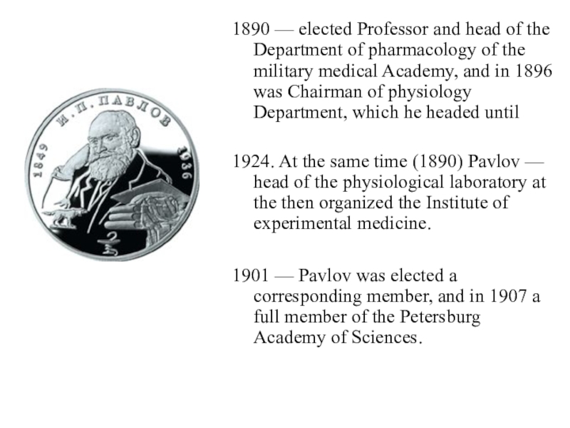 1901 — Pavlov was elected a corresponding member, and in 1907 a full member of the Petersburg Academy of Sciences.