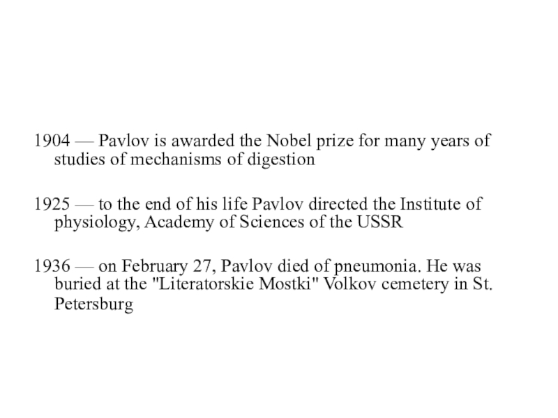 Слайд 121904 — Pavlov is awarded the Nobel prize for many years