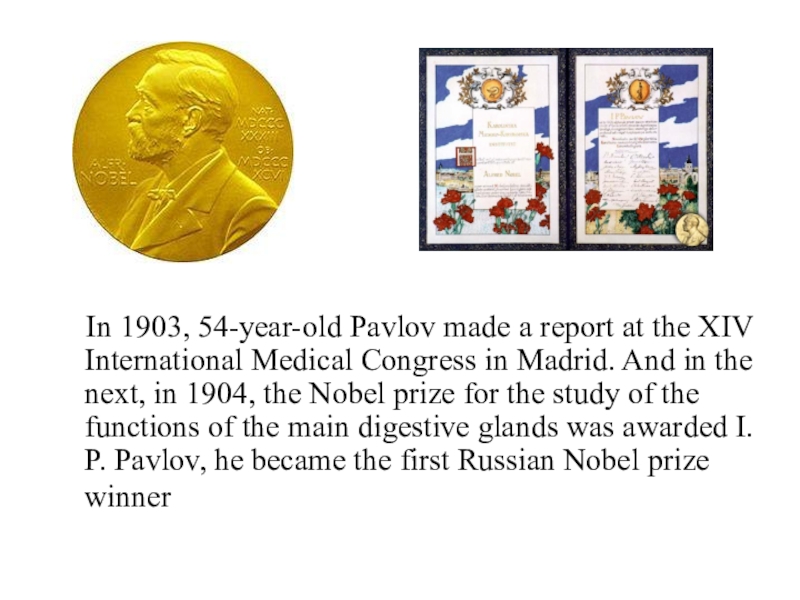 XIV International Medical Congress in Madrid. And in the next, in 1904, the Nobel prize for the study of the functions of the main digestive glands was awarded I. P. Pavlov, he became the first Russian Nobel prize winner