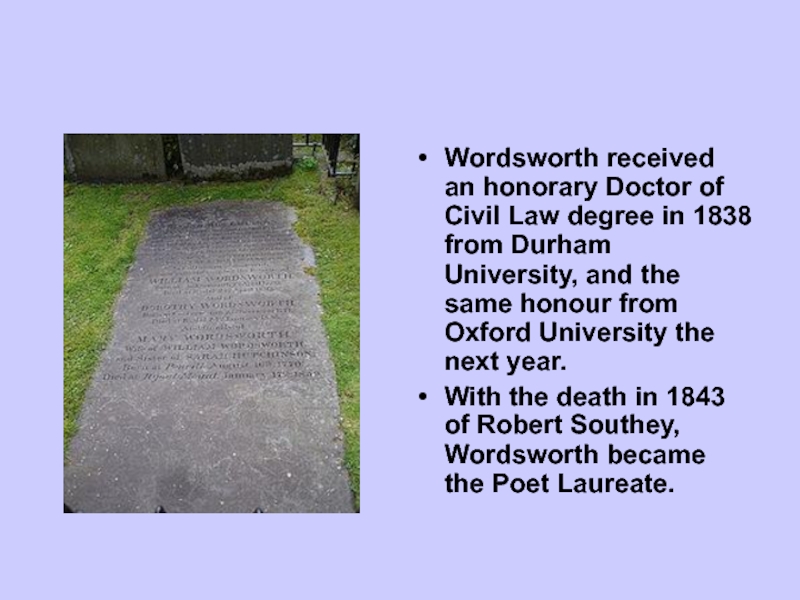 Слайд 12Wordsworth received an honorary Doctor of Civil Law degree in 1838