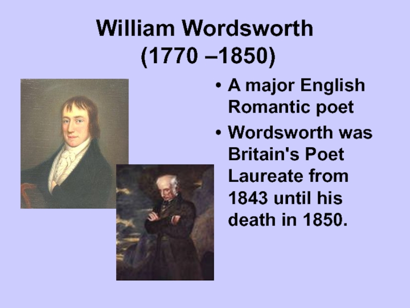 William Wordsworth  (1770 –1850)A major English Romantic poet Wordsworth was Britain's Poet Laureate from 1843 until