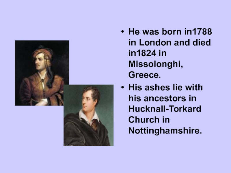 Слайд 14He was born in1788 in London and died in1824 in Missolonghi,