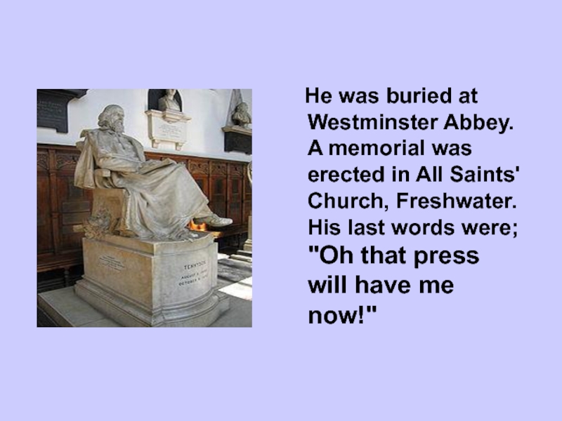 Слайд 7 He was buried at Westminster Abbey. A memorial was