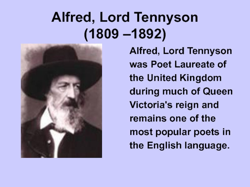 Alfred, Lord Tennyson  (1809 –1892) Alfred, Lord Tennysonwas Poet Laureate ofthe United Kingdomduring much of QueenVictoria's
