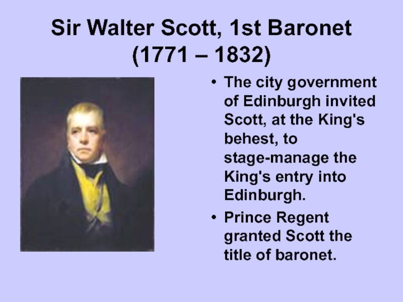 Sir Walter Scott, 1st Baronet (1771 – 1832)The city government of Edinburgh invited Scott, at the King's