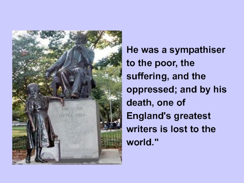 He was a sympathiserto the poor, thesuffering, and theoppressed; and by hisdeath, one ofEngland's greatestwriters is lost