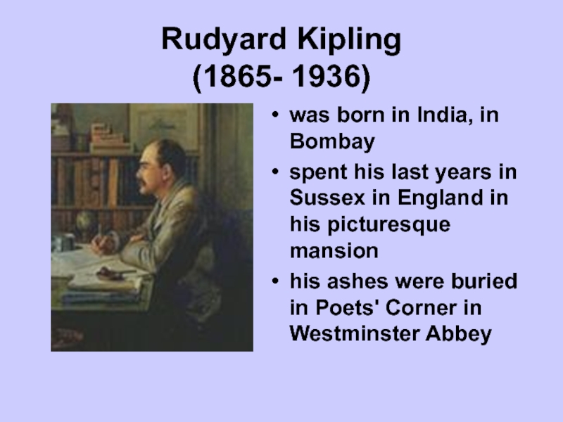 Rudyard Kipling (1865- 1936)was born in India, in Bombay spent his last years in Sussex in England