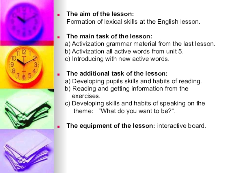 The aim of the lesson: Formation of lexical skills at the English lesson.The main task of the lesson: a) Activization grammar material from the last lesson. b) Activization all active