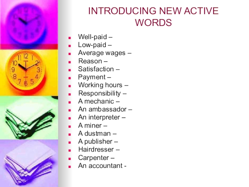 INTRODUCING NEW ACTIVE WORDSWell-paid –Low-paid –Average wages –Reason –Satisfaction –Payment –Working hours –Responsibility –A mechanic –An ambassador