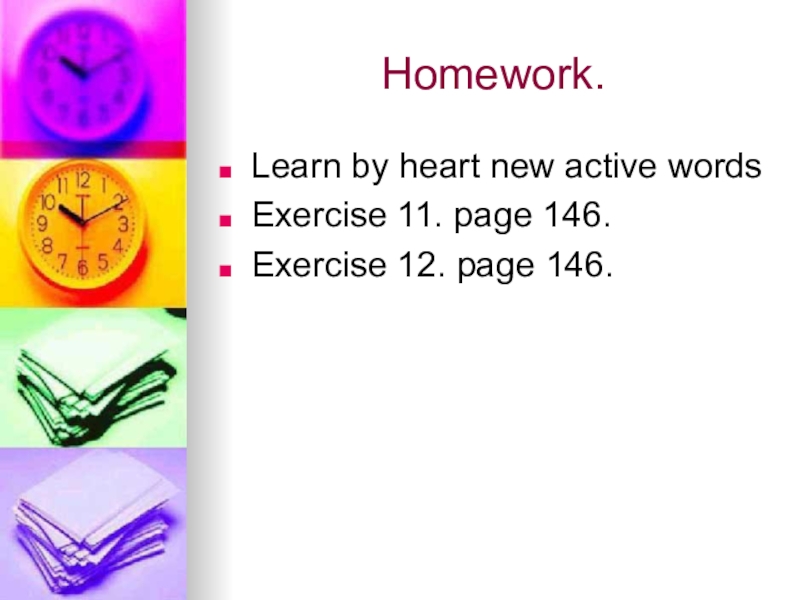 Homework.Learn by heart new active wordsExercise 11. page 146.Exercise 12. page 146.