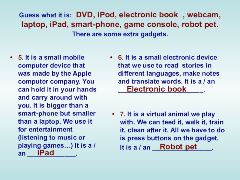 5. It is a small mobile computer device that was made by the Apple computer company. You can hold it in your hands and carry around with you. It is bigger than a smart-phone but smaller than a laptop. We use it for entertainment (listening to music or playing games…) It is a / an _____________.