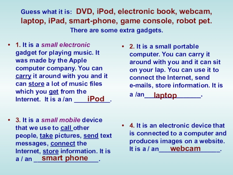 1. It is a small electronic gadget for playing music. It was made by the Apple computer company. You can carry it around with you and it can store a lot of music files which you get from the Internet. It is a /an __________.