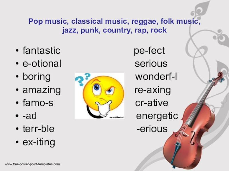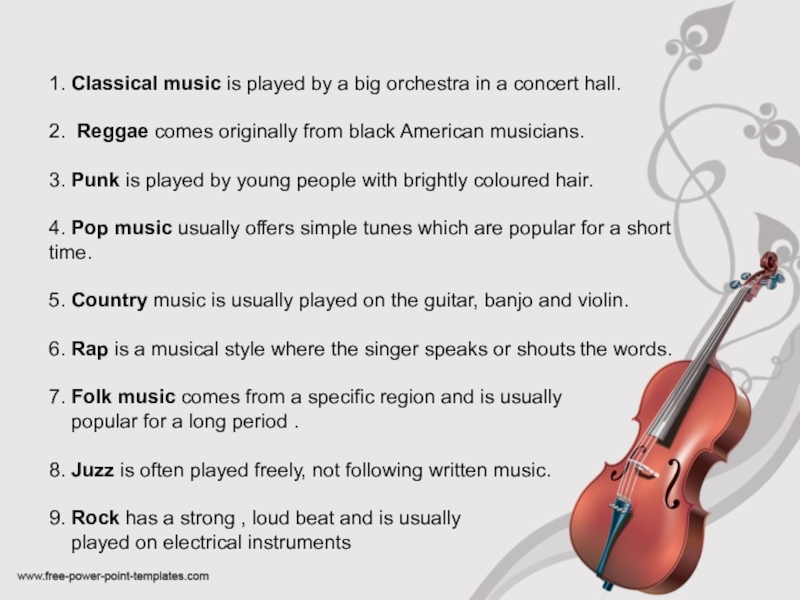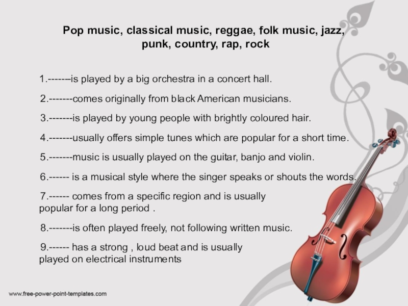 Pop music, classical music, reggae, folk music, jazz, punk, country, rap, rock