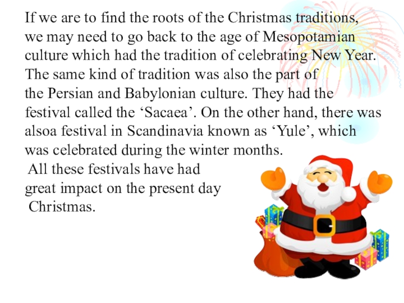 the Persian and Babylonian culture. They had the festival called the ‘Sacaea’. On the other hand, there was alsoa festival in Scandinavia known as ‘Yule’, which was celebrated during the winter months.
