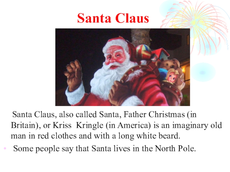 Britain), or Kriss Kringle (in America) is an imaginary old man in red clothes and with a long white beard.
