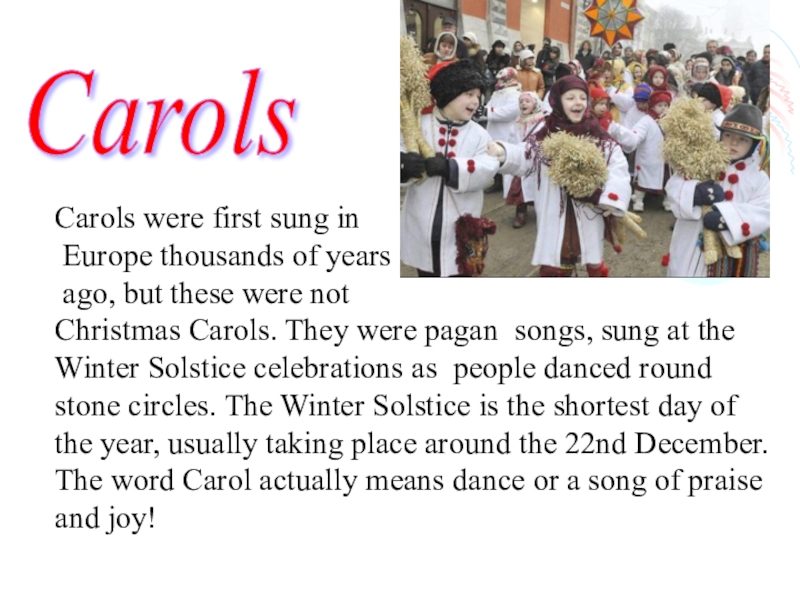 Christmas Carols. They were pagan songs, sung at the Winter Solstice celebrations as people danced round stone circles. The Winter Solstice is the shortest day of the year, usually taking place around the 22nd December. The word Carol actually means dance or a song of praise and joy!