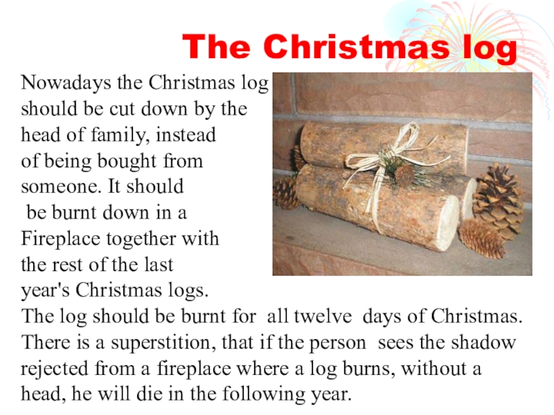 The log should be burnt for all twelve days of Christmas. There is a superstition, that if the person sees the shadow rejected from a fireplace where a log burns, without a head, he will die in the following year.