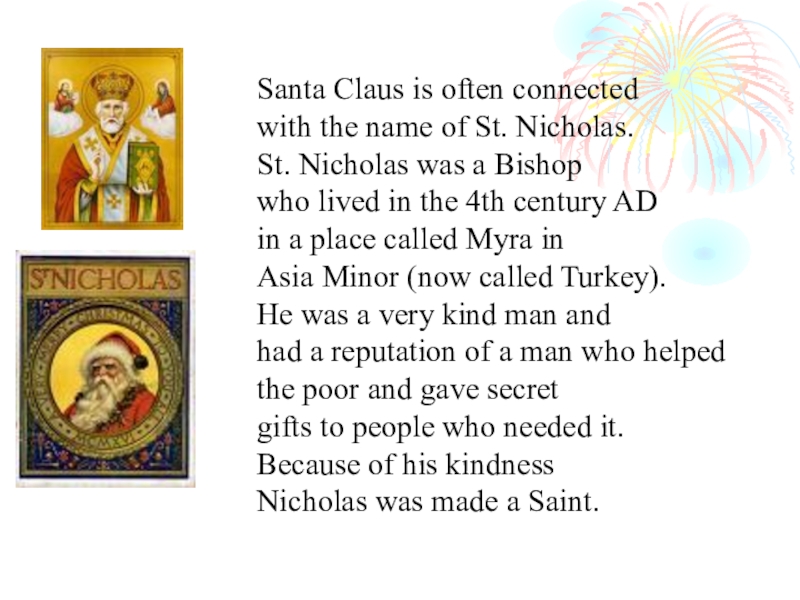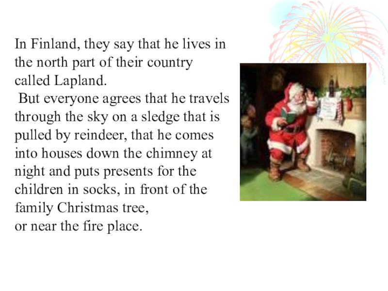 But everyone agrees that he travels through the sky on a sledge that is pulled by reindeer, that he comes into houses down the chimney at night and puts presents for the children in socks, in front of the family Christmas tree,