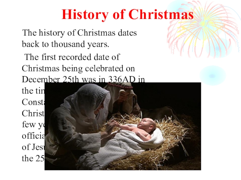 The first recorded date of Christmas being celebrated on December 25th was in 336AD in the time of the Roman Emperor Constantine (he was the first Christian Roman Emperor). A few years later Pope Julius I officially declared that the birth of Jesus would be celebrated on the 25th December.