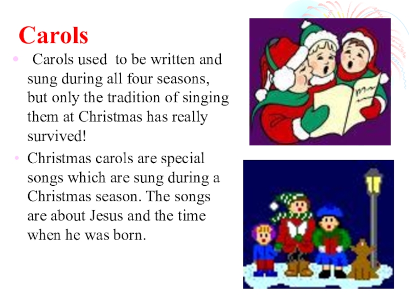 Christmas carols are special songs which are sung during а Christmas season. The songs are about Jesus and the time when he was born.