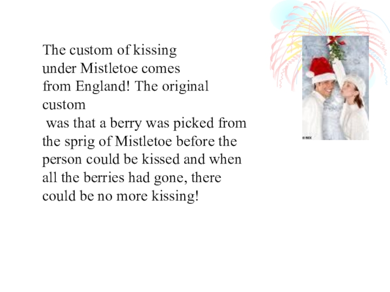 the sprig of Mistletoe before the person could be kissed and when all the berries had gone, there could be no more kissing!