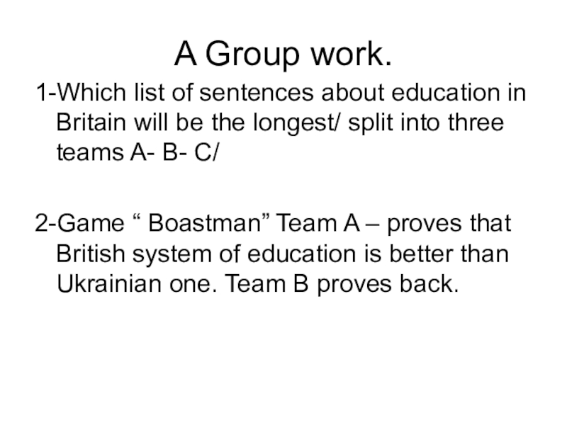 2-Game “ Boastman” Team A – proves that British system of education is better than Ukrainian one. Team B proves back.