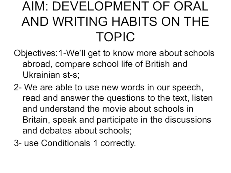 Слайд 3AIM: DEVELOPMENT OF ORAL AND WRITING HABITS ON THE TOPIC