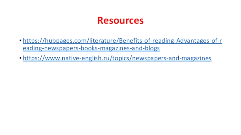 Resources https://hubpages.com/literature/Benefits-of-reading-Advantages-of-reading-newspapers-books-magazines-and-blogshttps://www.native-english.ru/topics/newspapers-and-magazines