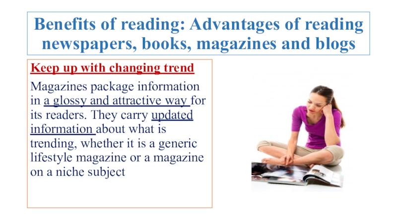 Слайд 9Benefits of reading: Advantages of reading newspapers, books, magazines and blogs