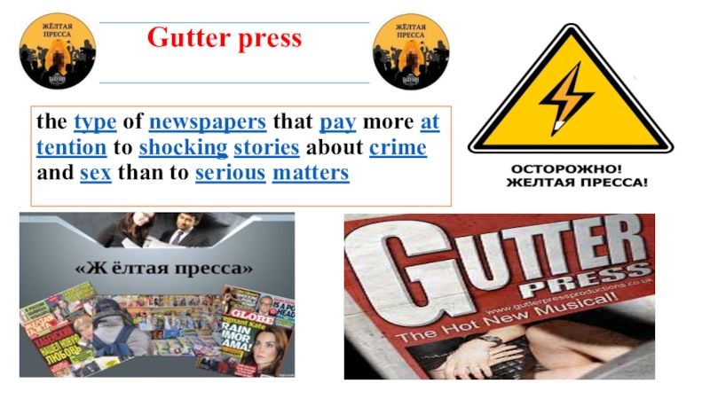 Gutter press  the type of newspapers that pay more attention to shocking stories about crime and sex than to serious matters