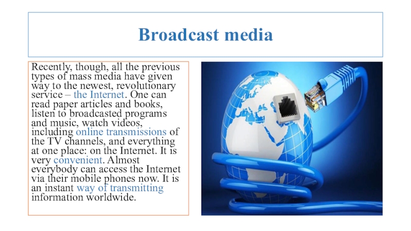 Broadcast mediaRecently, though, all the previous types of mass media have given way to the newest, revolutionary