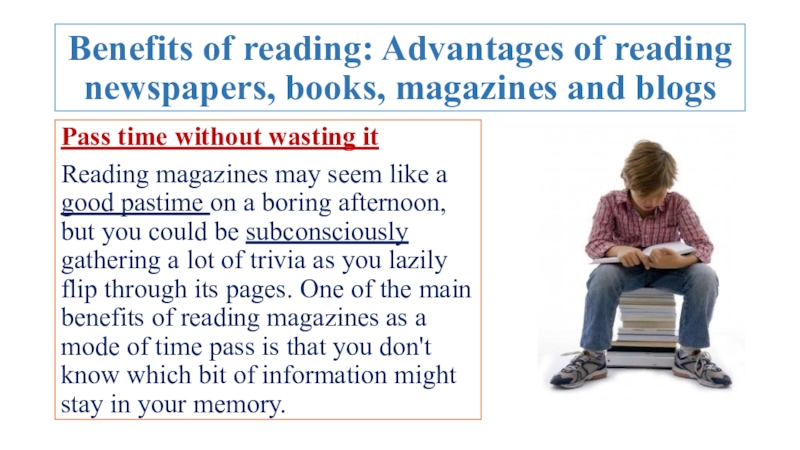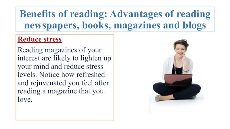 Слайд 8Benefits of reading: Advantages of reading newspapers, books, magazines and blogs